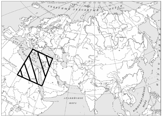 Версия для печати и копирования в MS WordЗаштрихуйте на контурной карте один четырёхугольник, образованный градусной сеткой (параллелями и меридианами), где полностью или частично было расположено государство, в котором был изобретён древнейший алфавит.