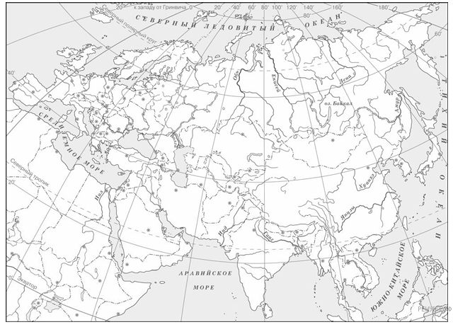 Заштрихуйте на контурной карте один четырехугольник, образованный градусной сеткой (параллелями и меридианами), в котором полностью или частично расположена страна, где существовала варна вайшьев.